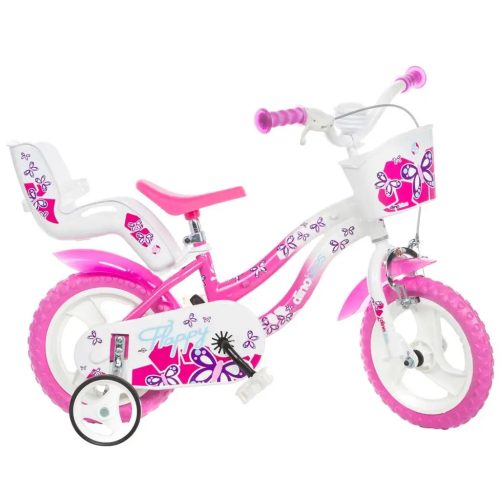 Flappy 12” gyerek bicikli kosárral és babaüléssel rózsaszín-fehér színben - Dino Bikes kerékpár