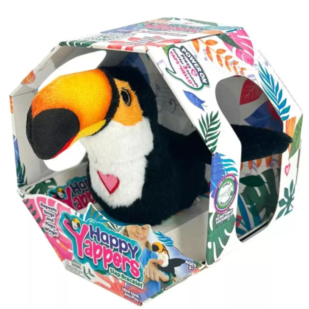 A Happy Yappers Tukán nemcsak puha, ölelgethető plüssfigura, hanem egy interaktív társ is, aki mindig mosolyt csal a gyerekek arcára. Beszélgethetsz vele, ő visszamondja, amit hall, énekel, csapkod a szárnyaival, sőt, a barátaival is tud kommunikálni!