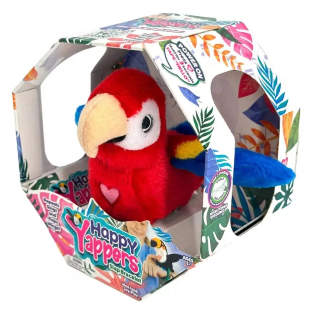 A Happy Yappers interaktív plüss piros papagáj egy igazán szórakoztató és egyedi játék, amely a gyerekek képzeletét is megmozgatja! Csak pattintsd a színes slap bracelet csuklópántot a kezedre, és a papagáj mindig veled tarthat, bárhová is mész. A mellkasán található szív gomb megnyomásával a papagáj ismétli, amit mondasz, énekel, csapkod a szárnyaival, sőt, más Happy Yappers figurákkal is képes „beszélgetni”. Vidám hangokkal és mozgásokkal szórakoztat, így a gyerekek könnyedén elmerülhetnek a játék örömteli világában. Tökéletes ajándék, hiszen egyszerre puha plüssfigura és interaktív játszótárs, aki minden kalandot még izgalmasabbá tesz. Engedd, hogy a Happy Yappers piros papagáj beköltözzön otthonodba, és kezdődhet a közös, vidám játék!