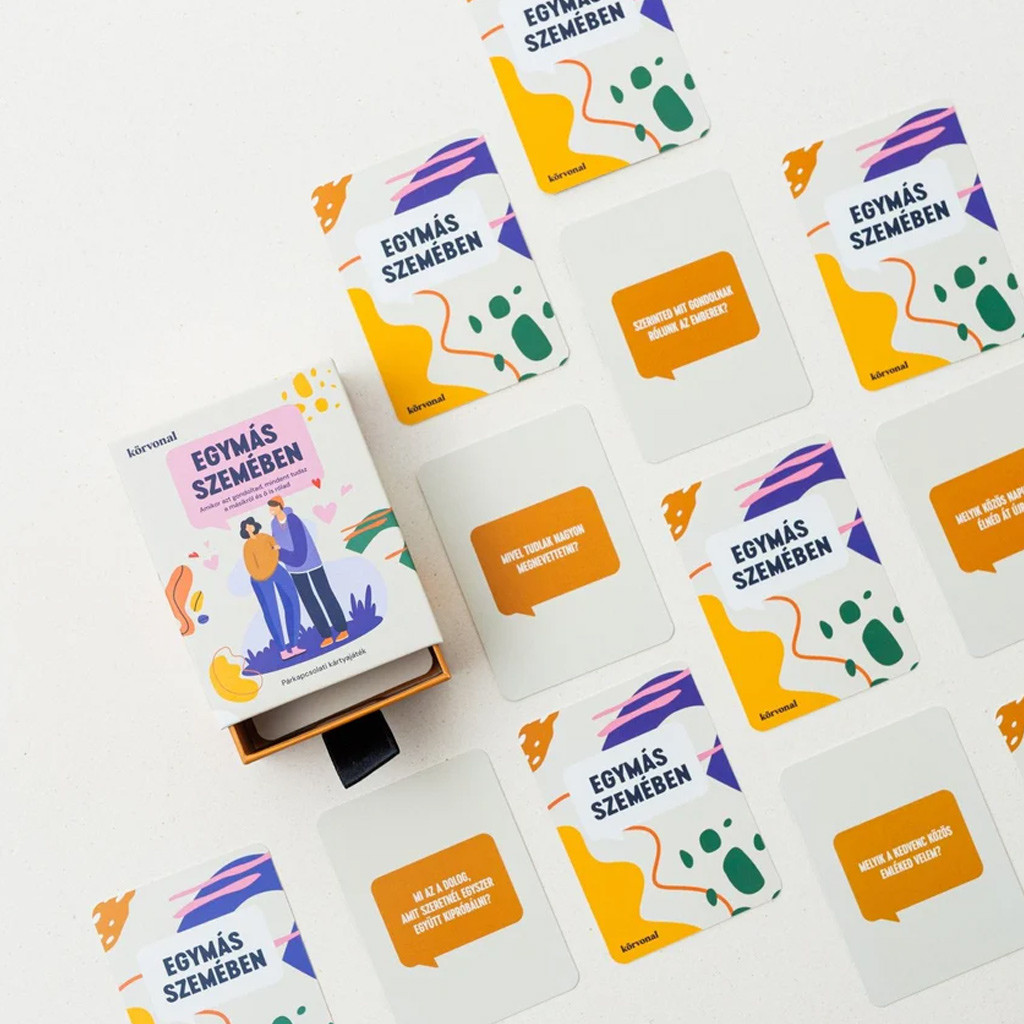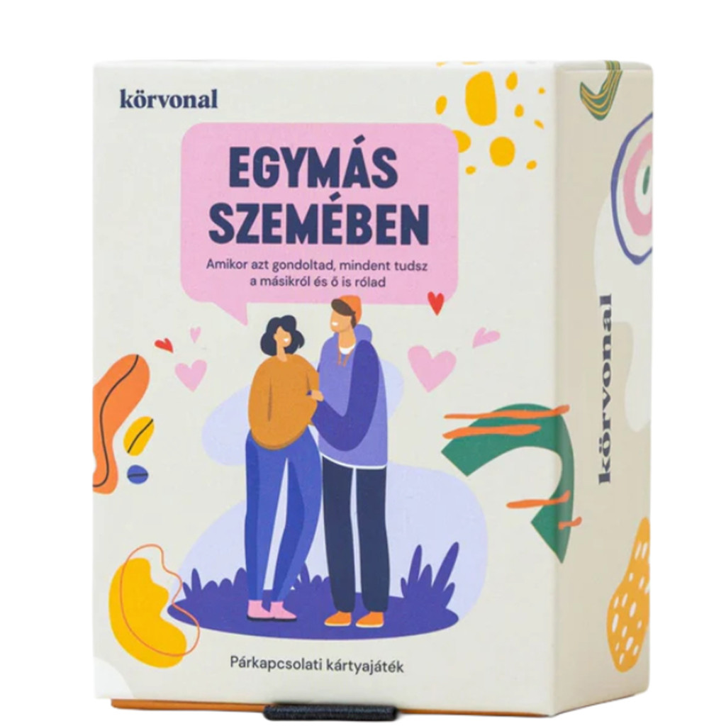 Körvonal – Egymás szemében egy párkapcsolati kártyajáték, amely segít új oldalról megismerni a másikat – még akkor is, ha úgy érzed, már mindent tudtok egymásról. Ez a játék támogat abban, hogy mélyebb szinten kapcsolódjatok, őszintén megnyíljatok egymás előtt, és olyan kérdésekre válaszoljatok, amelyek a hétköznapok forgatagában ritkán kerülnek szóba. Tökéletes választás mindazoknak, akik szeretnének közelebb kerülni egymáshoz, jobban megérteni egymás érzéseit, gondolatait, emlékeit.