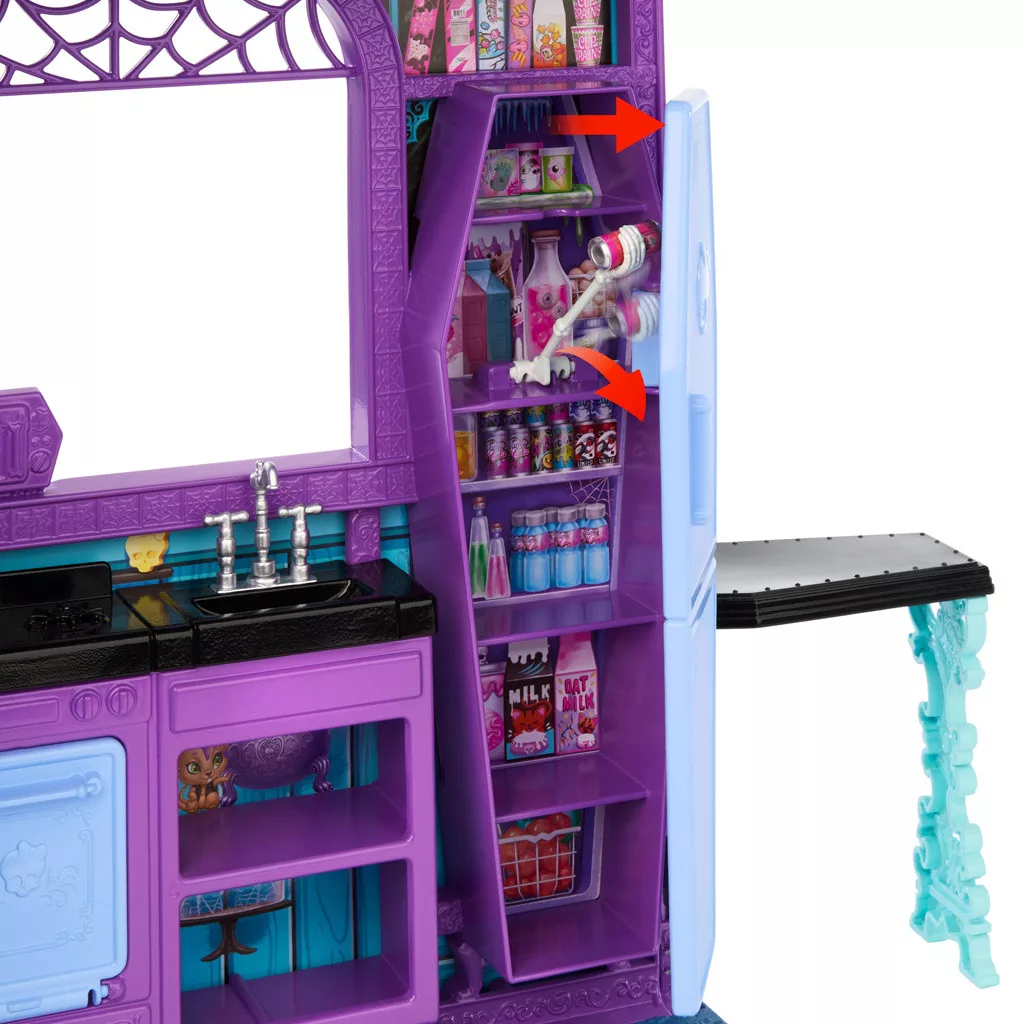 A szettben több mint 13 bútordarab és kiegészítő található, amelyek tökéletesen illeszkednek a Monster High világához: étkezőasztal, trónszék, mosdó, hűtőszekrény, valamint egyedi dekorációk, amelyek életre keltik a szörnyhotelt. A játékház különleges részletei – például a kihúzható csontkéz a hűtőből vagy a felnyíló vécé, amelyben egy mókás kis szörny rejtőzik – még izgalmasabbá teszik a kalandokat.