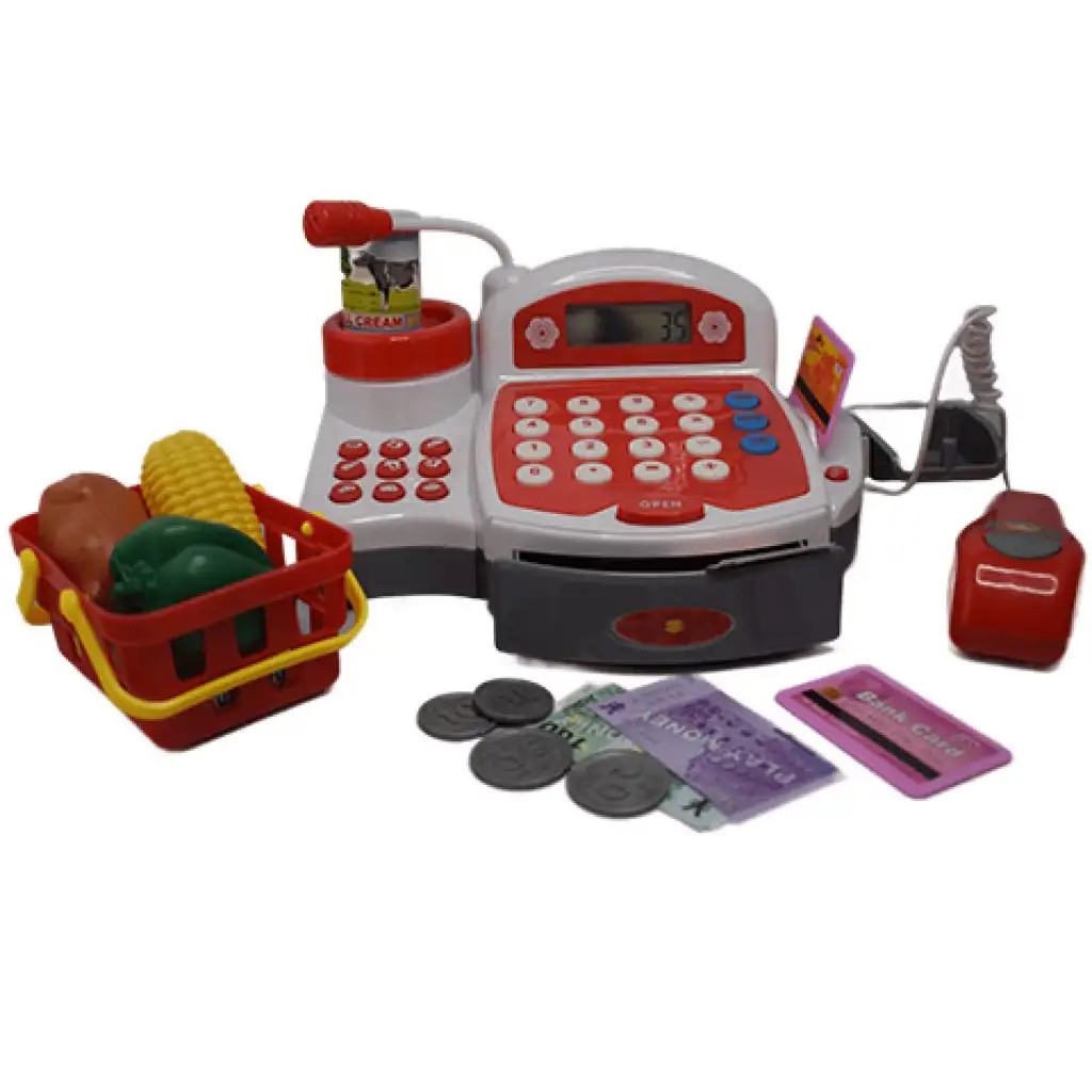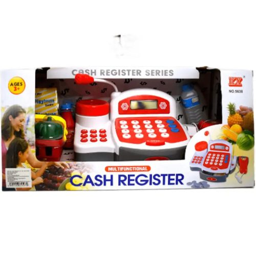Piros funkciós elektromos pénztárgép játékpénzzel, termékekkel és hanggal