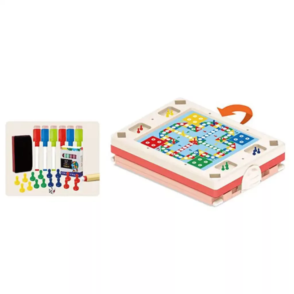 Ez a kreatív gyerekek számára tervezett különleges rajztábla garantáltan elnyeri a kicsik tetszését, hiszen nem csupán rajzolásra alkalmas, hanem egy mozdulattal kényelmes rajállvánnyá is alakítható, valamint társasjátékozásra is remekül használható. A készlet egy praktikus, fogantyúval ellátott, strapabíró műanyag táskában található, mely könnyedén szétnyitható, és stabilan rögzíthető akár álló helyzetben is. A dobozon belül minden olyan kiegészítő megtalálható, amire a gyerekeknek az alkotáshoz vagy játékhoz szükségük lehet: színes, letörölhető filcek, szivacs, továbbá a tábla hátulján kialakított, "KI nevet a végén?" elnevezésű társasjátékhoz szükséges bábuk és dobókocka.