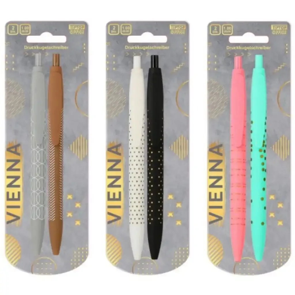 A háromféle változatban elérhető Spirit Vienna golyóstoll szett ideális választás mindazok számára, akik modern, elegáns és figyelemfelkeltő tollat keresnek. A bliszteres csomagban 2 darab toll található, melyek különleges mintázattal díszítettek, így azonnal magukra irányítják a figyelmet. Az erős műanyag ház gumírozott markolattal van kiegészítve, ezért írás közben a használatuk kényelmes és egyszerű. A tollakat felszerelték egy műanyag csíptetővel is, hogy könnyen magaddal vihesd bárhová. Az ár egyféle változatra vonatkozik, ezért rendelésnél a kívánt változatot kérjük, hogy a "megjegyzés" rovatban tüntesd fel!