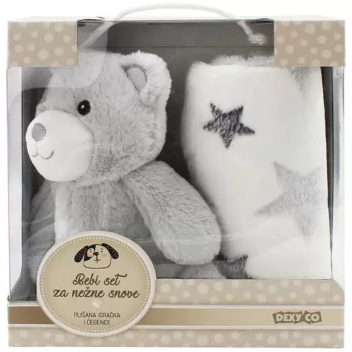 A készletben található szürke maci hamar a kicsi első barátjává válik, aki minden pihenésnél, alvásnál és ölelésre vágyó pillanatban ott lehet mellette. Aranyos, mosolygós arca és puha tapintása biztonságérzetet ad, így a baba könnyebben ellazul és nyugodtan alhat. A fehér alapszínű, csillagmintás takaró igazi álomkuckóvá varázsolja a kiságyat vagy babakocsit – puhasága és melegsége minden évszakban ideális.