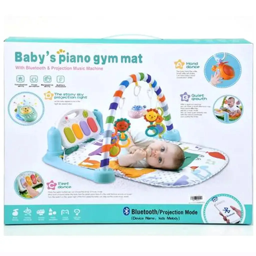 A szőnyeghez tartozik egy nagy, élénk nyomógombokkal díszített elektronikus szintetizátor, amely különféle hangokkal szórakoztatja a piciket.